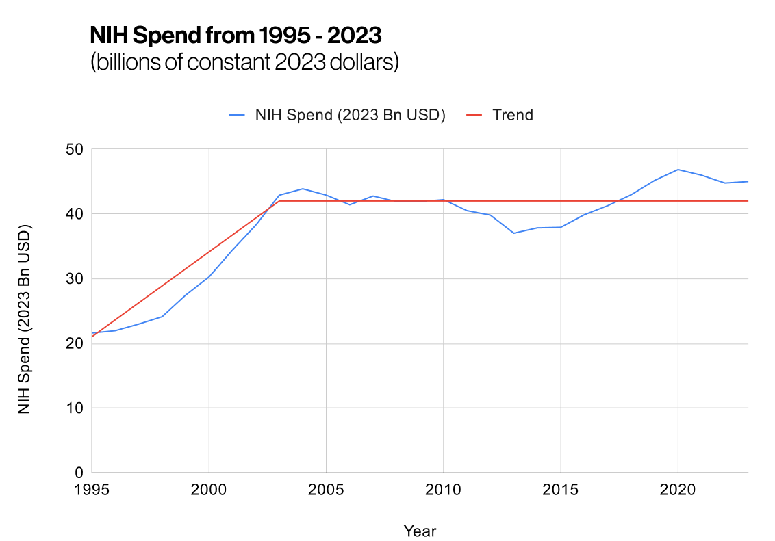 Now notice that the NIH portfolio was held flat in real terms until 2015 at ~$40bn / yr. The purpose of the NIH was to be able to tell a senator “we spent $X on your state” with a side effect of occasionally meriting some interesting research. [I’m saving what I really think of the NIH for a future article; let’s stick with a basic analysis here.]