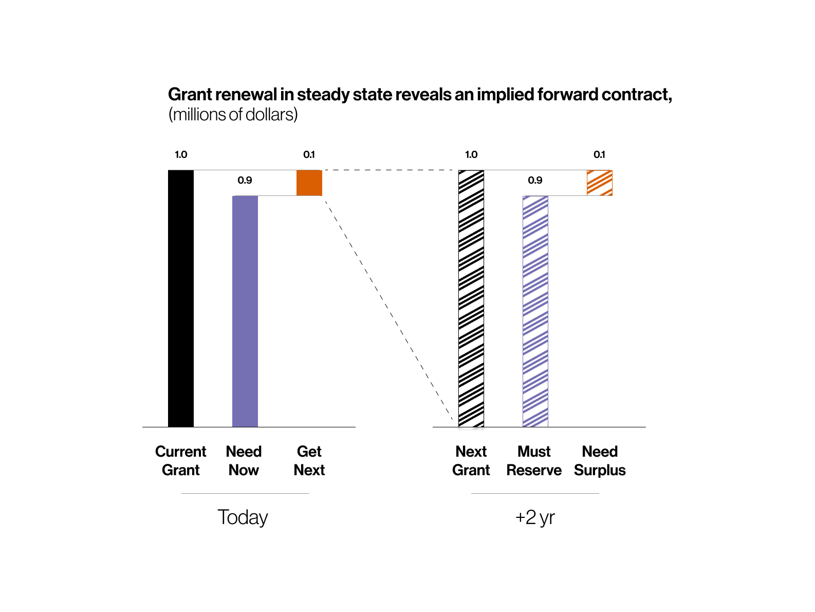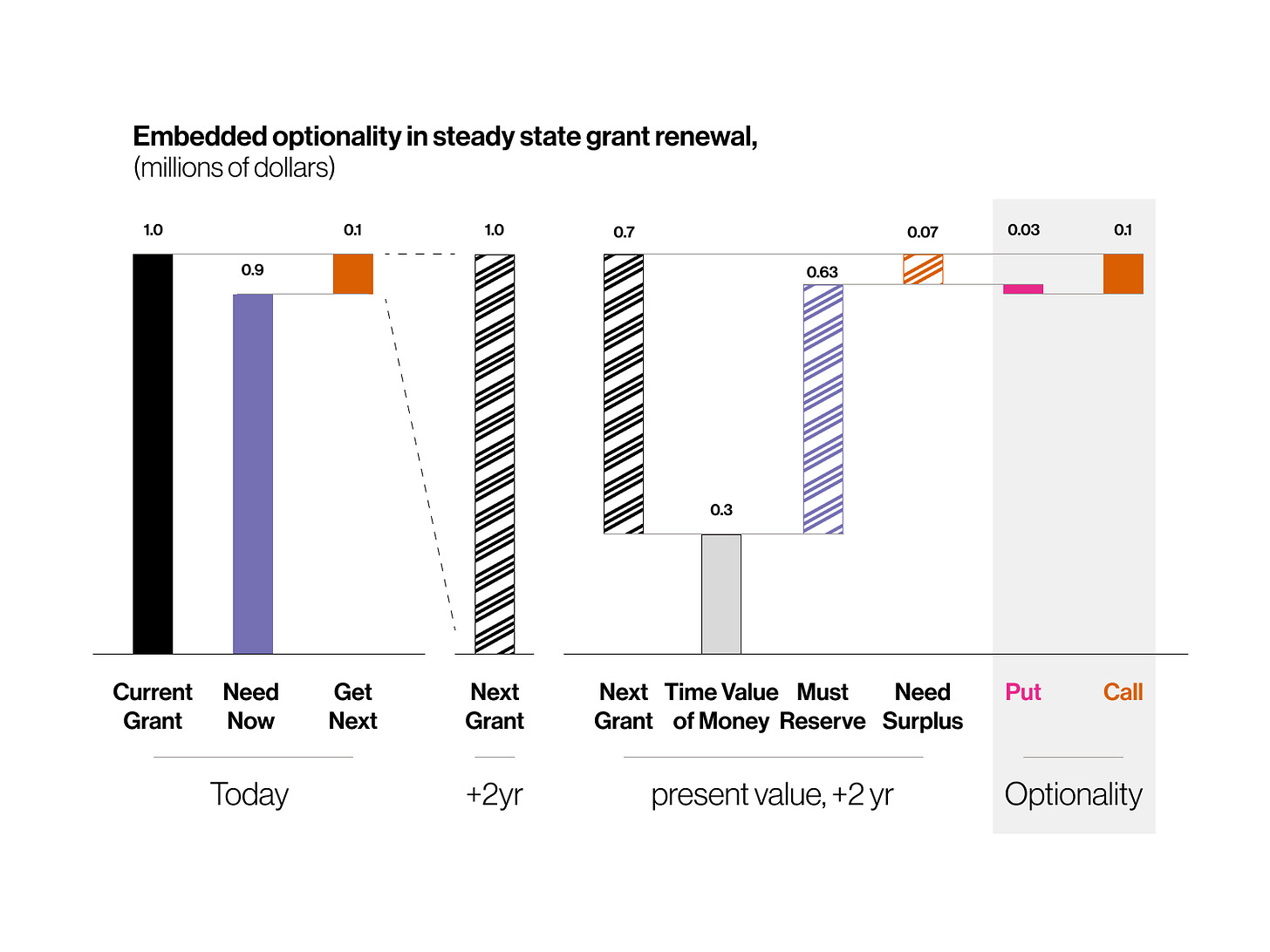 Now imagine your laboratory [/ a boutique firm] is in steady state, neither growing nor shrinking. That means the grant renewal cycle creates a forward on research where you break even2. If an R01 grant is $1 million ($1mm) let’s say you’ll get the money two years from now. We can split that again into two pieces, $0.9mm that is essentially an obligation and $0.1mm that’s the surplus.